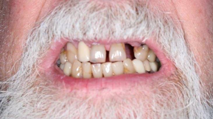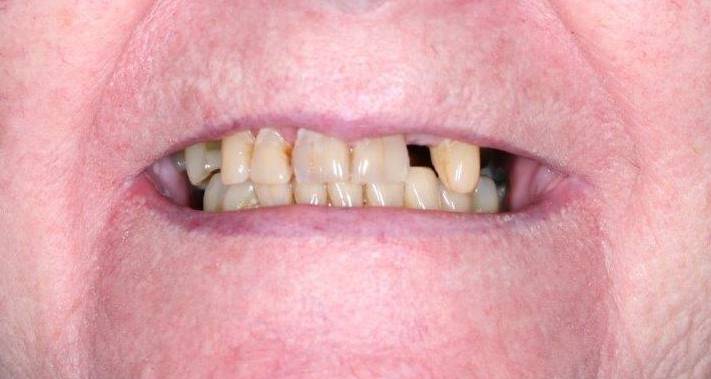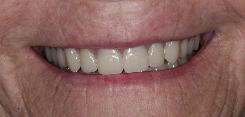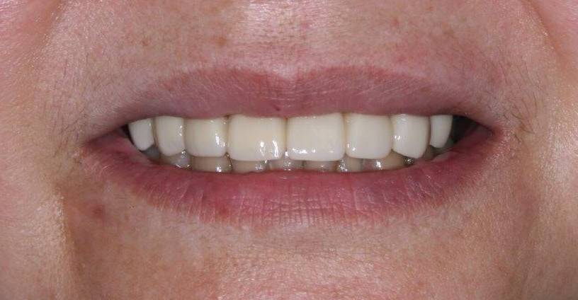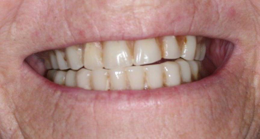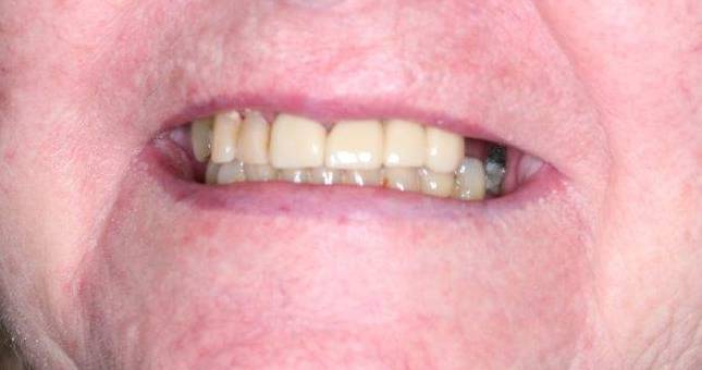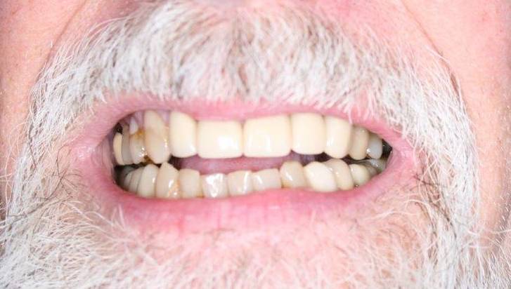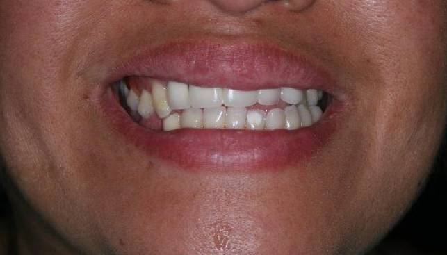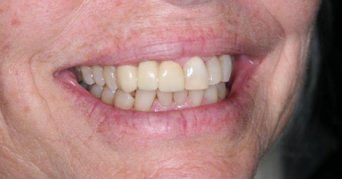 3 new crowns on lower anterior Replaced decayed and broken teeth on the bottom with porcelain fused to zirconia crowns